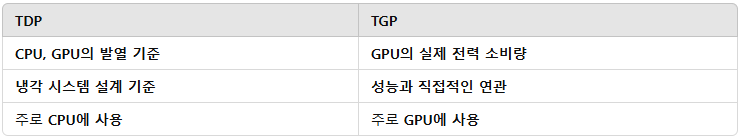 - GPU도 마찬가지로, 실제 소비 전력은 **TGP(Total Graphics Power)**에 따라 달라질 수 있습니다.
