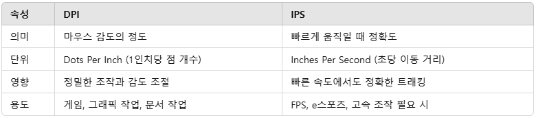 - 최고의 성능을 원한다면 DPI와 IPS가 모두 높은 마우스를 선택하는 것이 중요함.