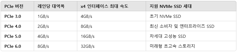NVMe는 PCIe 인터페이스를 기반으로 하며, PCIe 세대별로 성능이 지속적으로 향상되고 있습니다.