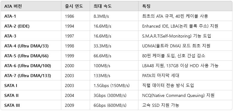 - 속도 제한 – PATA는 133MB/s로 한계, SATA가 등장하며 성능 부족 문제 해결됨.