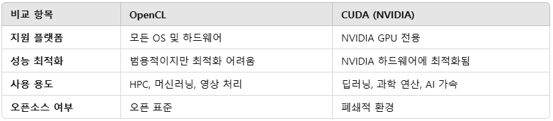 ❌ 드라이버 및 하드웨어 지원 문제: 일부 GPU/FPGA는 OpenCL 지원이 제한적.