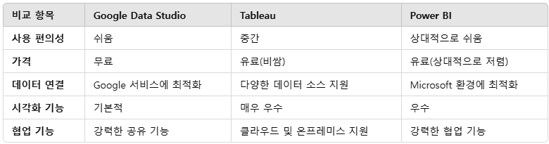 ⚖️ 5. Google Data Studio vs 다른 BI 도구 비교