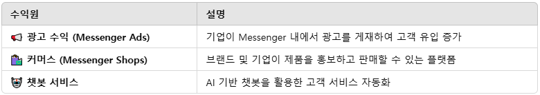 Messenger는 기본적으로 무료 서비스이지만, 비즈니스 및 광고 수익 모델을 통해 수익을 창출하고 있습니다.
