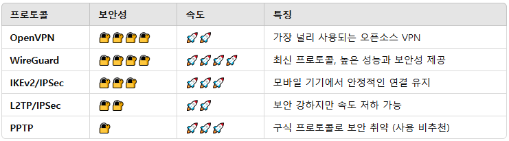 VPN은 다양한 **프로토콜(데이터 전송 방식)**을 사용하여 보안을 유지하고 네트워크 성능을 최적화합니다.
