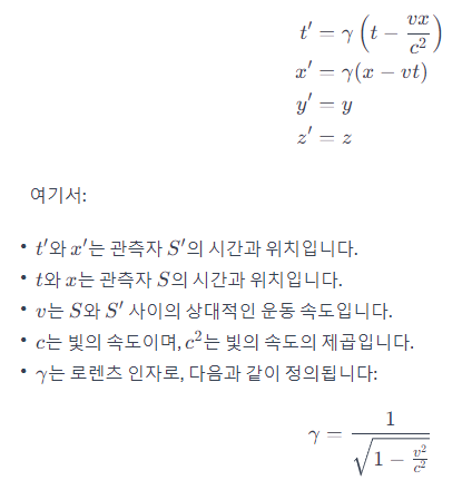 로렌츠 변환의 기본 수식은 다음과 같습니다.