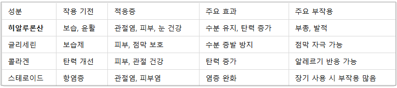 - 작용 기전: 수분 유지, 세포 보호, 항염 작용