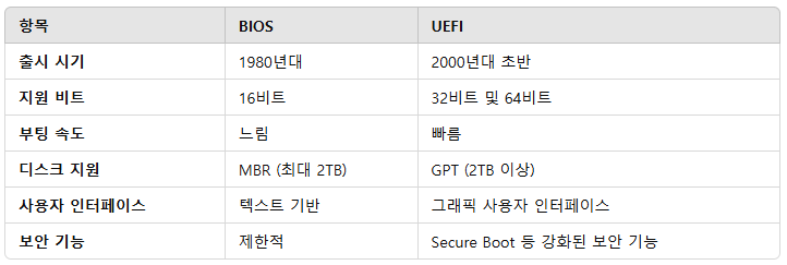 - BIOS의 MBR(Master Boot Record) 대신 GPT를 지원하여 2TB 이상의 저장 장치를 사용할 수 있음.