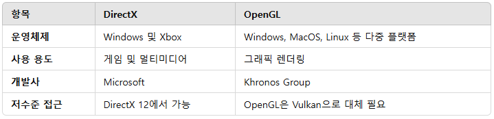 - 주로 게임 개발에 활용되며, 개발자가 하드웨어의 복잡한 부분을 직접 다루지 않아도 고성능을 발휘할 수 있도록 돕습니다.